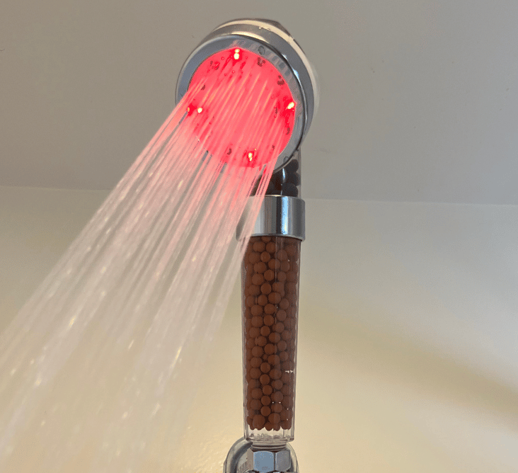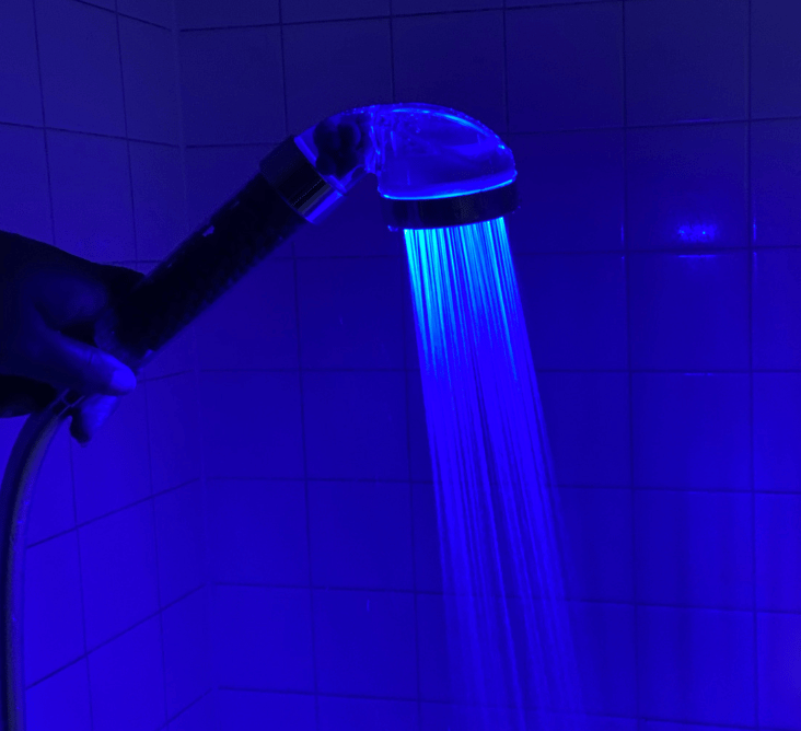 The showerhead uses built-in LEDs powered by water flow, along with mineral stones for filtration, improving water purity and softening while adding a visual light display.
